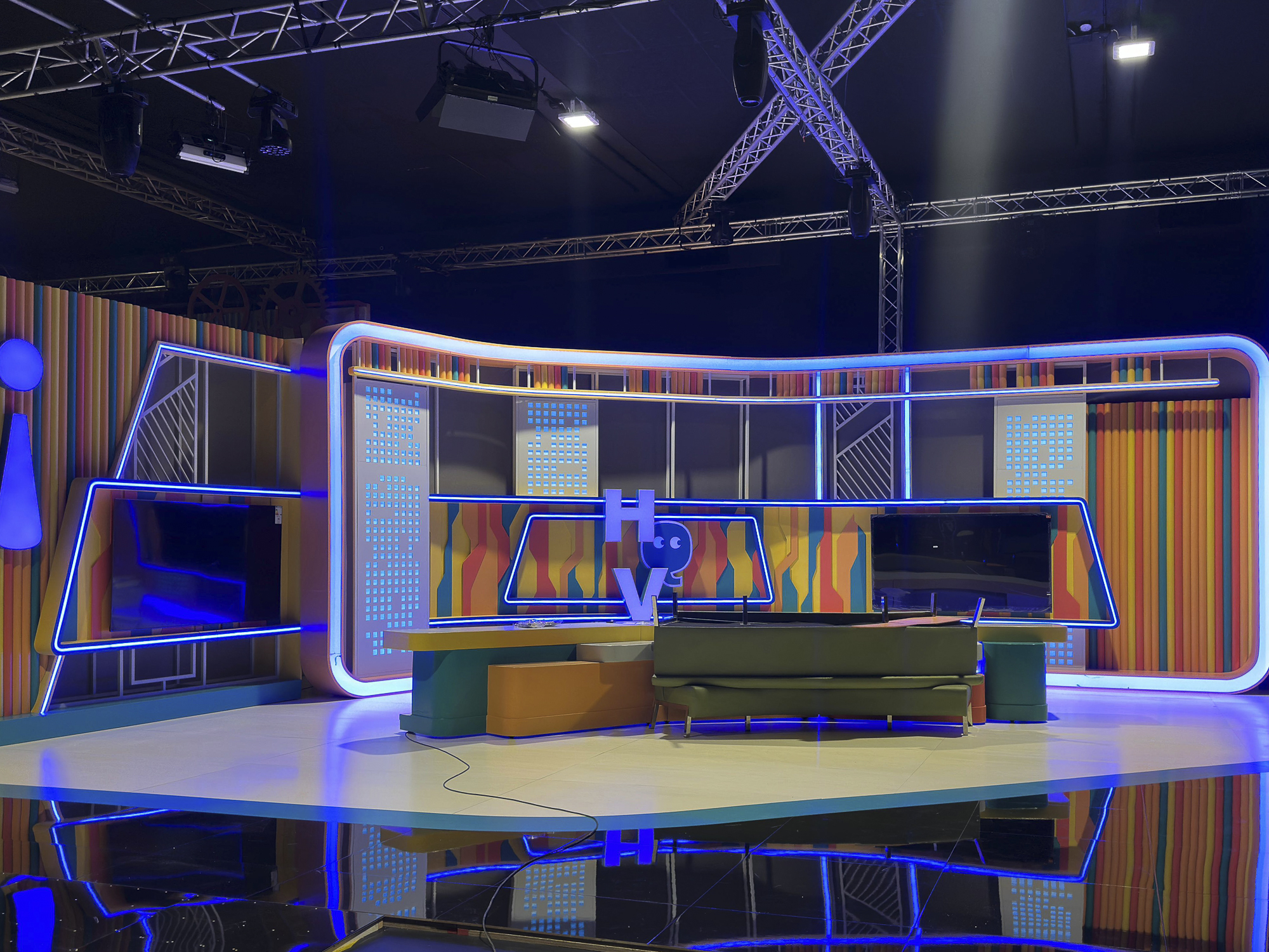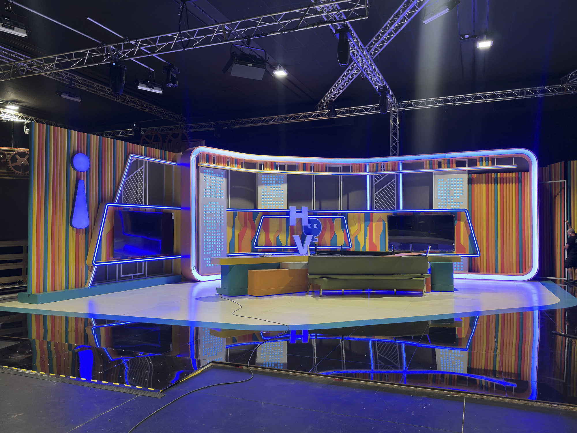 Escenografía modular: estructuras desmontables que facilitan cambios de set y adaptación a distintas secciones del programa.